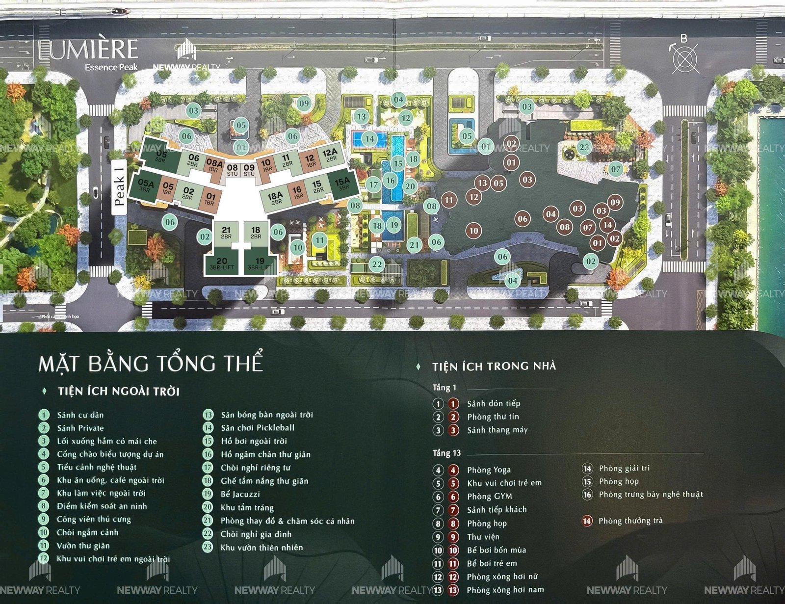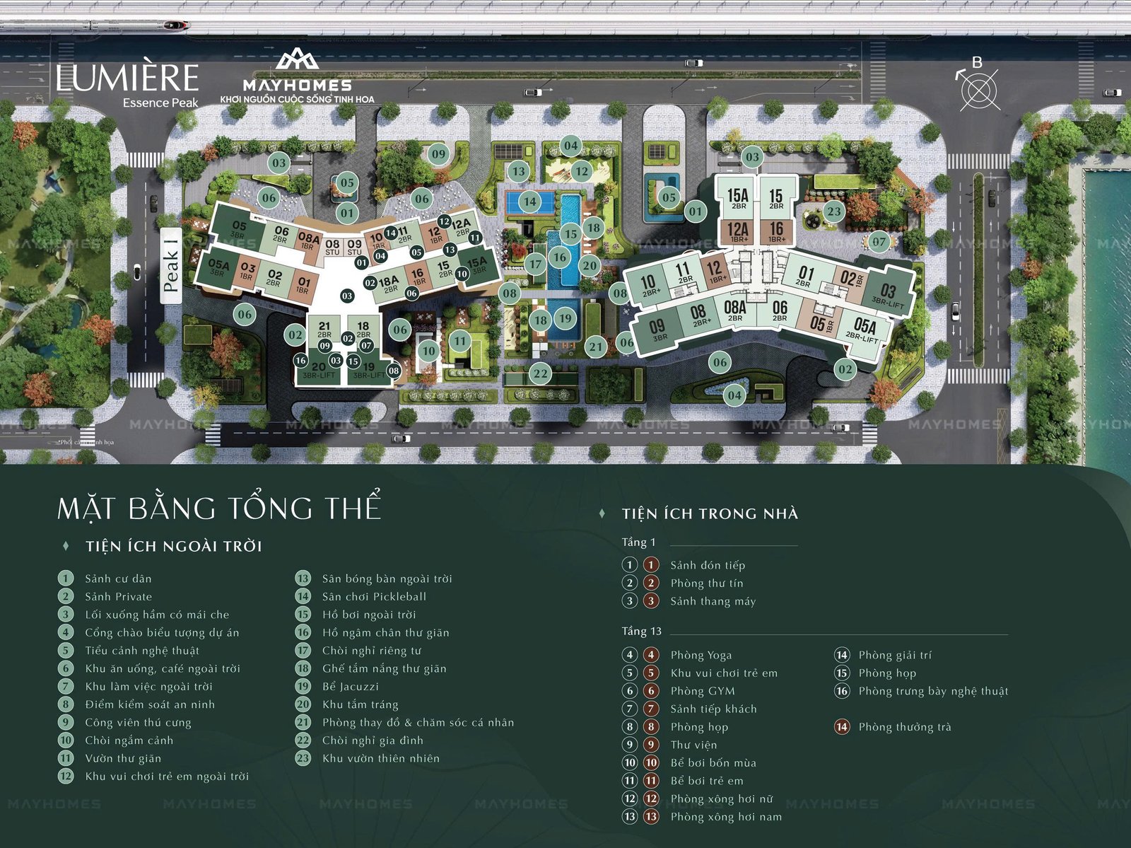 Mặt bằng tổng thể dự án Lumier Essence Peak được quy hoạch bài bản với mật độ xây dựng thấp, ưu tiên tối đa không gian xanh và mặt nước.